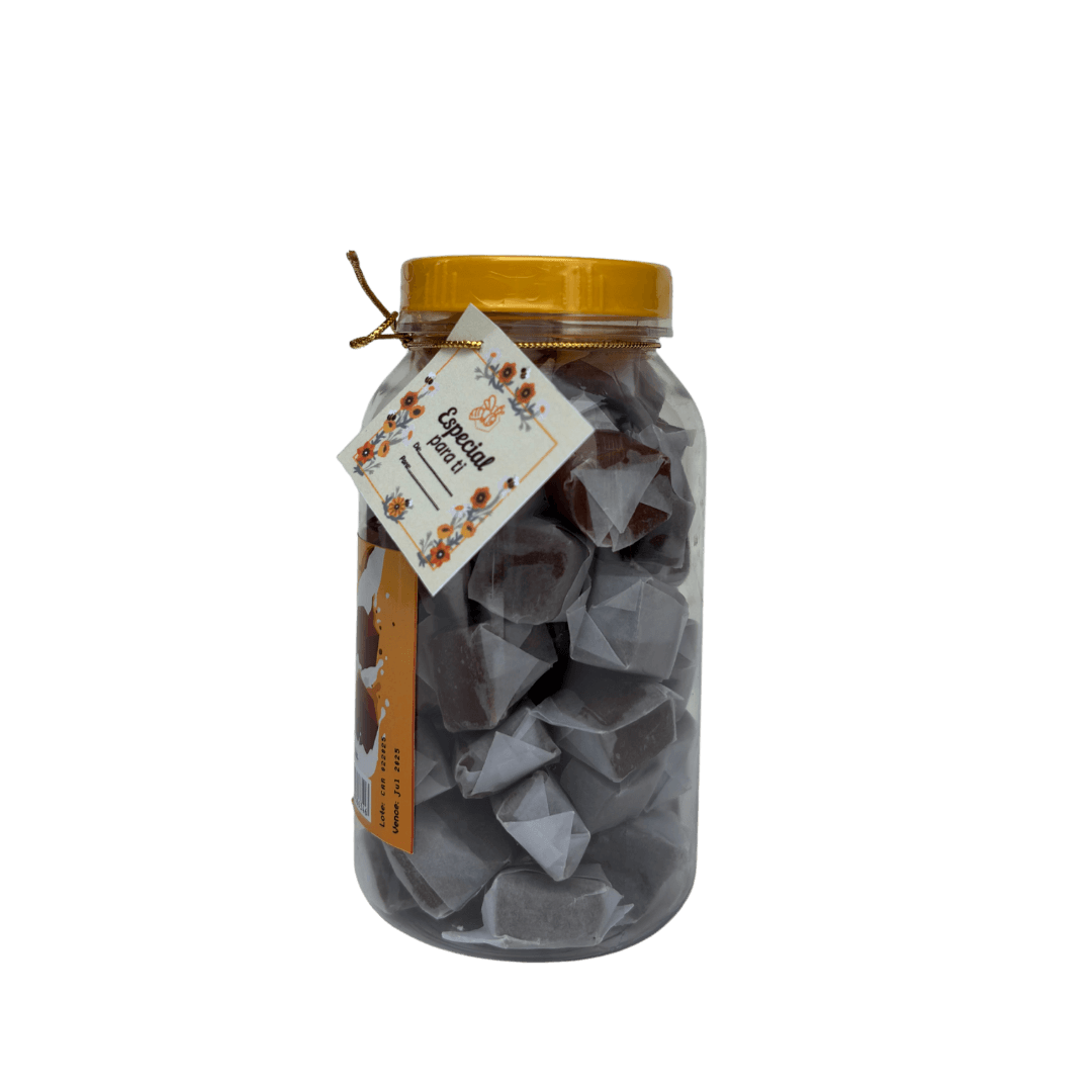 Cada frasco contiene 50 unidades, cuidadosamente envueltas y presentadas en un envase PET con tapa de seguridad, tarjeta decorativa y lazos dorados. Este formato no solo conserva su frescura, sino que también lo convierte en un detalle ideal para fechas especiales, celebraciones o como muestra de cariño natural y saludable.